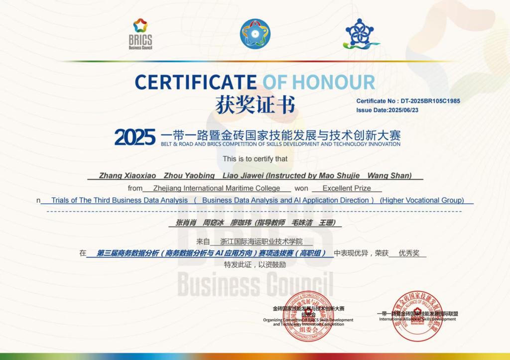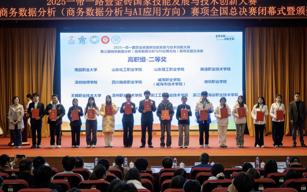 10月26日,2025一带一路暨金砖国家技能发展与技术创新大赛——第三届商务数据分析赛项(商务数据分析与AI应用方向)赛项全国总决赛在山东工程职业技术大学圆满落幕。由毛姝洁、王珊2位老师指导,我校现代港口贸易学院徐东、陈诗涵、胡京选3名同学组成的参赛队凭借扎实的专业功底与创新的实践能力,荣获高职组二等奖,学校获优秀组织奖,2位老师获优秀指导老师奖。