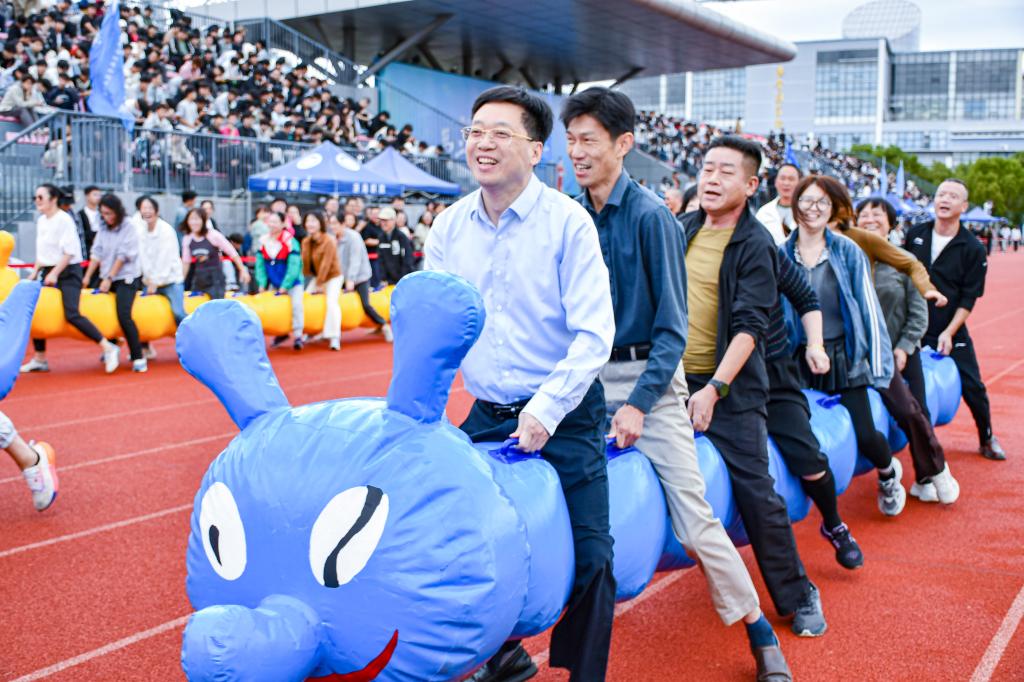 当日,本校区8个分工会的运动员围绕5个项目展开激烈角逐。赛事设置兼顾竞技性与趣味性:铅球、立定跳远两项个人赛考验教职工的个人体能与技巧,毛毛虫竞速、同心鼓、拔河三项团体赛则聚焦团队协作与默契配合。校党委书记蔡志军等校领导亲临现场,不仅为运动员加油助威,更亲自下场参赛,与教职工们同场竞技;赛场周边,师生们的加油喝彩声此起彼伏,热烈氛围感染着每一位参与者,让秋日的校园充满活力。