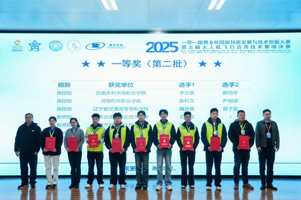12月25日-28日,2025一带一路暨金砖国家技能发展与技术创新大赛第五届无人机飞行应用技术赛项决赛在云南水利水电职业学院圆满落幕。由我校海洋装备工程学院卓宏明、于朋涛两位老师指导,黄科龙、黄书文两名同学组成的参赛队,凭借精准的飞行操控与高效的故障排查能力,荣获学生高校组一等奖,并以决赛第3名的优异成绩晋级北非国际赛未来技能挑战赛;施鑫煜老师则在教师组竞赛中脱颖而出,斩获一等奖且以第3名的成绩晋级北非国际赛技术创新大赛。