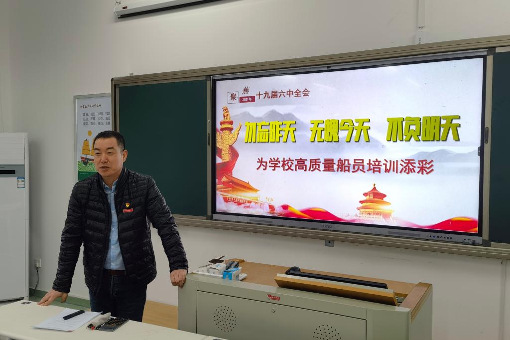 陈永芳部长以《勿忘昨天,无愧今天,不负明天,为学校高质量船员培训添彩》为题,围绕党的十九届六中全会精神展开讲述。课上,陈永芳部长勉励支部的党员们能够切实增强社会培训服务能力、拓展培训项目,对接国家战略,开设特色培训项目。