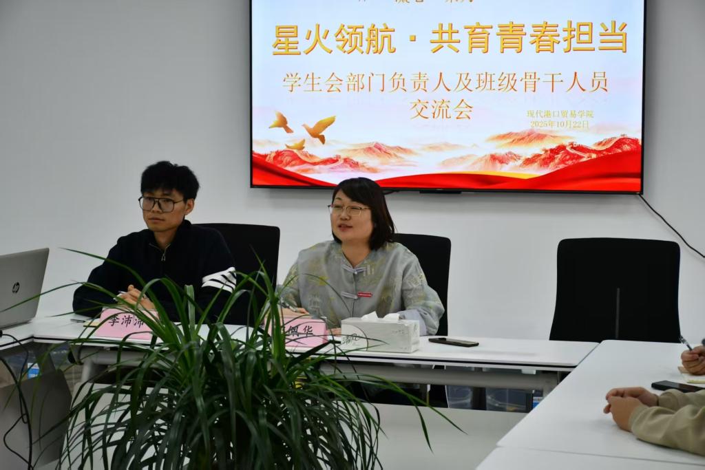 10月22日,现代港口贸易学院以“星火领航,共育青春担当”为主题,在学院会议室召开学生会部门负责人与班级骨干人员交流会。学院党总支副书记邵佩华、团委老师李沛沛及全体学生骨干齐聚一堂,共话职责使命,共谋服务发展。