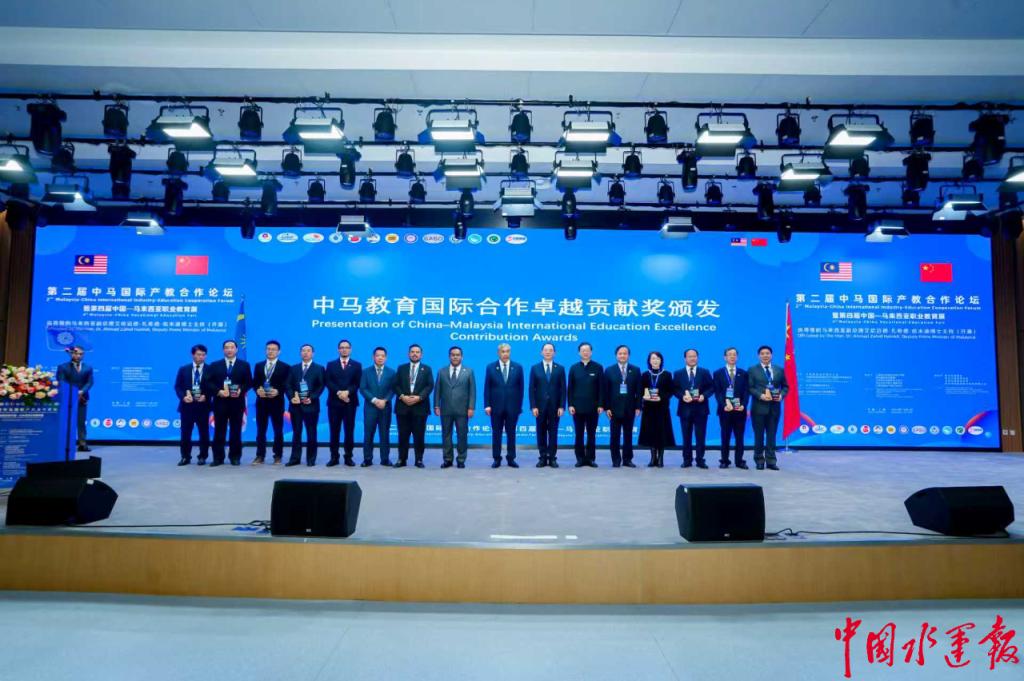本次论坛内容丰富多彩,涵盖领导致辞、中马产教国际合作学院发布、国际职业技术技能资格认证项目发布、产教共同体成立、中马产业人才培养与就业项目启动仪式、中马职教培训计划发布及颁奖仪式等多个环节。在颁奖仪式上,我校荣获“2024—2025中马教育国际合作卓越贡献奖”。