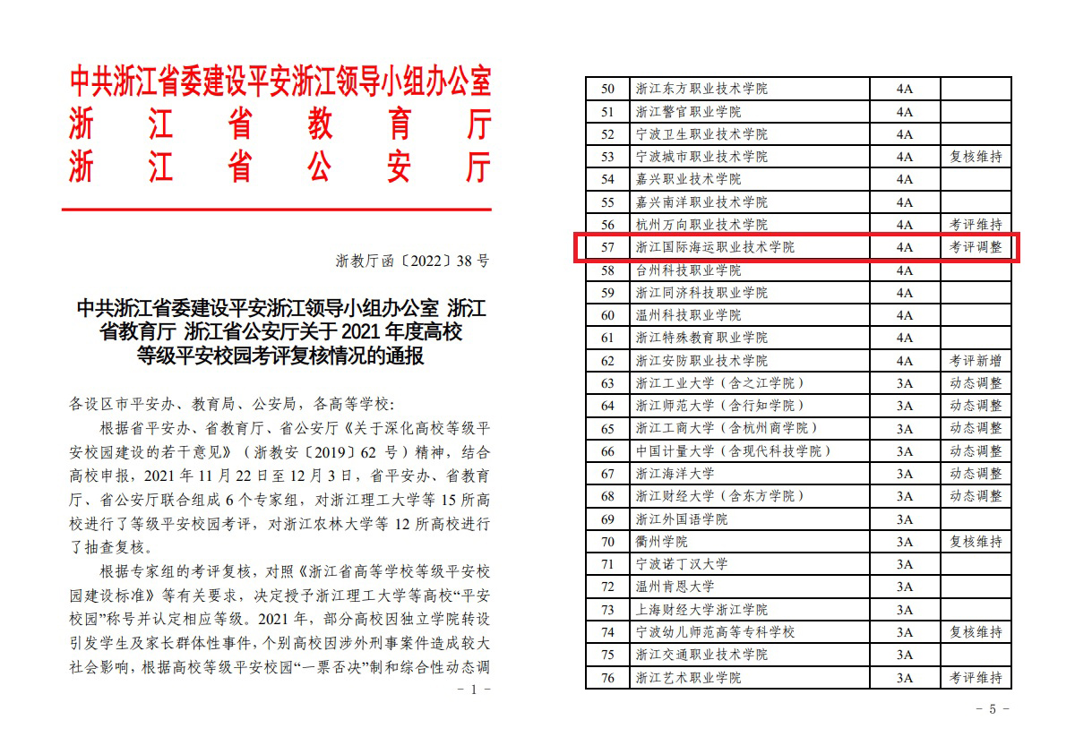 近日,浙江省委建设平安浙江领导小组办公室、省教育厅、省公安厅下发了《关于2021年度高校等级平安校园考评复核情况的通报》,我校顺利通过浙江省高校等级平安校园建设4A等级平安校园认定。