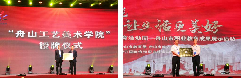 仪式现场,我校与市经济和信息化局深化校地合作,共建舟山工艺美术学院;与舟山技师学院开展中高职一体化专业“职技融合”人才培养试点,共同为“智能装备学院”授牌。