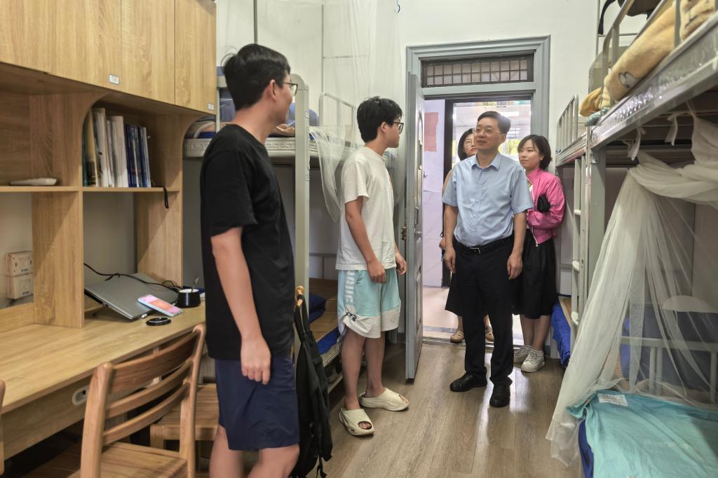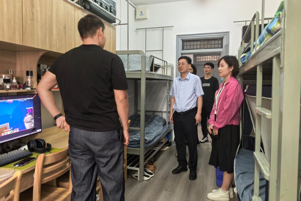 蔡志军书记一行深入学生寝室,与留校学生亲切交流,仔细倾听学生假期安排和学习、生活情况,叮嘱大家科学规划时间,兼顾学业与身心健康,合理安排作息与锻炼。