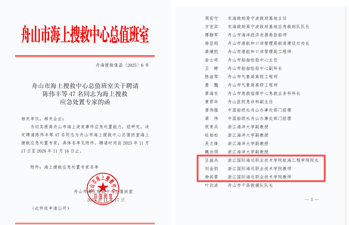 此次成功入选专家库既是对3名教师个人专业水平的认可,也是学校办学实力与行业服务能力的体现。接下去,他们将按照专家职责要求,协助舟山市海上搜救中心参与海上突发事件应急处置方案制定,提供专业技术指导和决策建议,为保障舟山海域航行安全、提升海上应急救援效能贡献高校智慧与力量。(图文/付军)