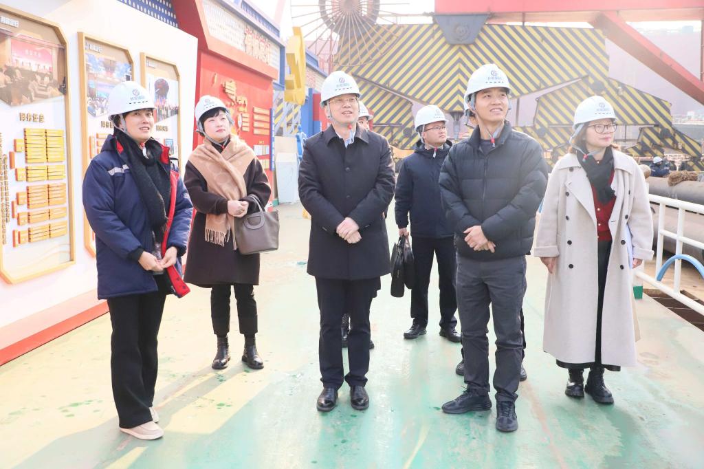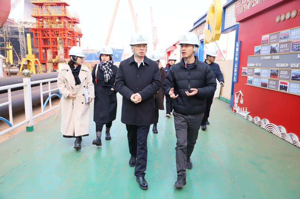 蔡志军书记一行首先参观了长宏国际船舶修造有限公司装配平台、船坞、码头等生产现场,详细了解了公司的设备设施、产品类型、订单情况以及企业发展历程。