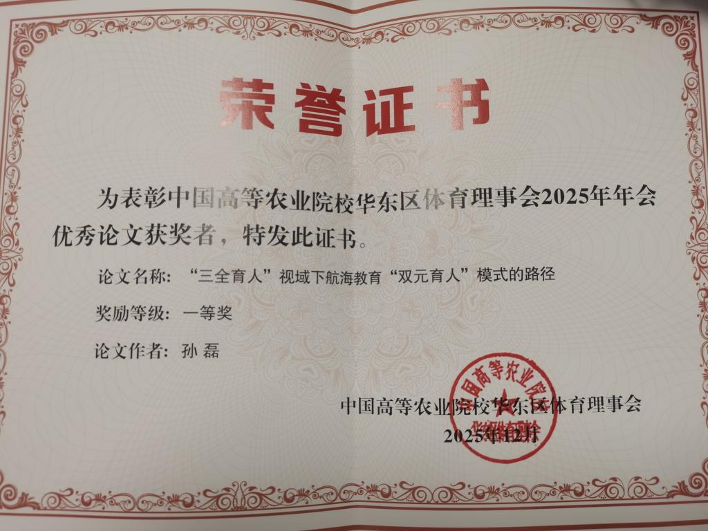此外,孙磊老师的论文《“三全育人”视域下航海教育“双元育人”模式的路径》,在中国高等农业院校华东区体育理事会2025年会中荣获一等奖,进一步彰显了我校体育科研的多元发展实力。