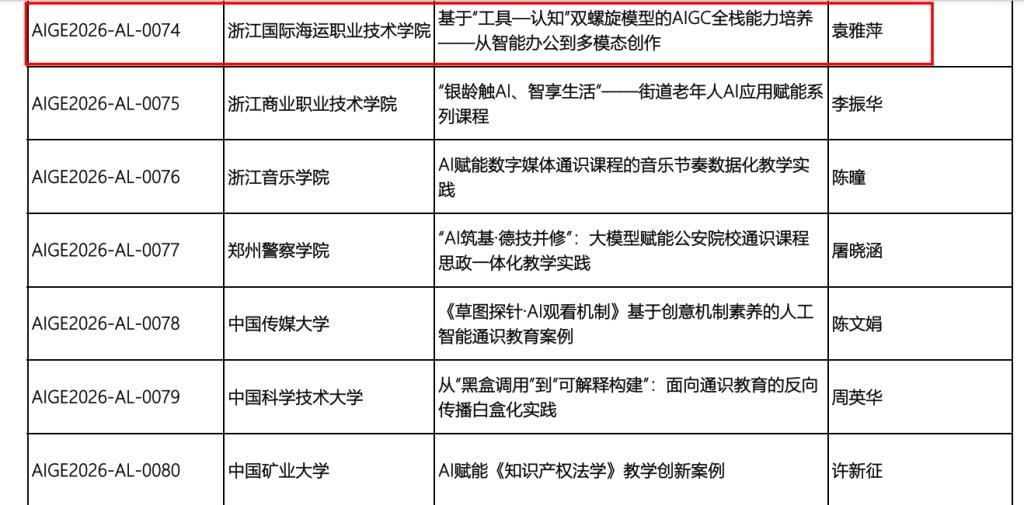 近日,全国高等院校计算机基础教育研究会人工智能通识教育专业委员会公布 “AIGE2026人工智能通识教育大会优秀案例征集活动”评审结果。我校现代港口贸易学院袁雅萍老师提交的教学案例《基于“工具—认知”双螺旋模型的AIGC全栈能力培养——从智能办公到多模态创作》,经专家严格评审,成功入选全国高等院校人工智能通识教育优秀案例。