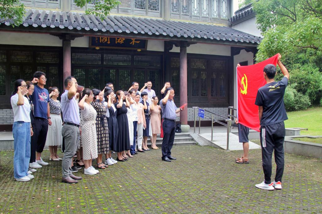 百年征程波澜壮阔,百年初心历久弥坚。根据学校党史学习教育安排,6月30日,学校在爱国主义教育基地东海阁举行了新发展党员、新党员集中入党宣誓暨社科体艺部党总支重温入党誓词活动。校党委副书记孔志光领誓。