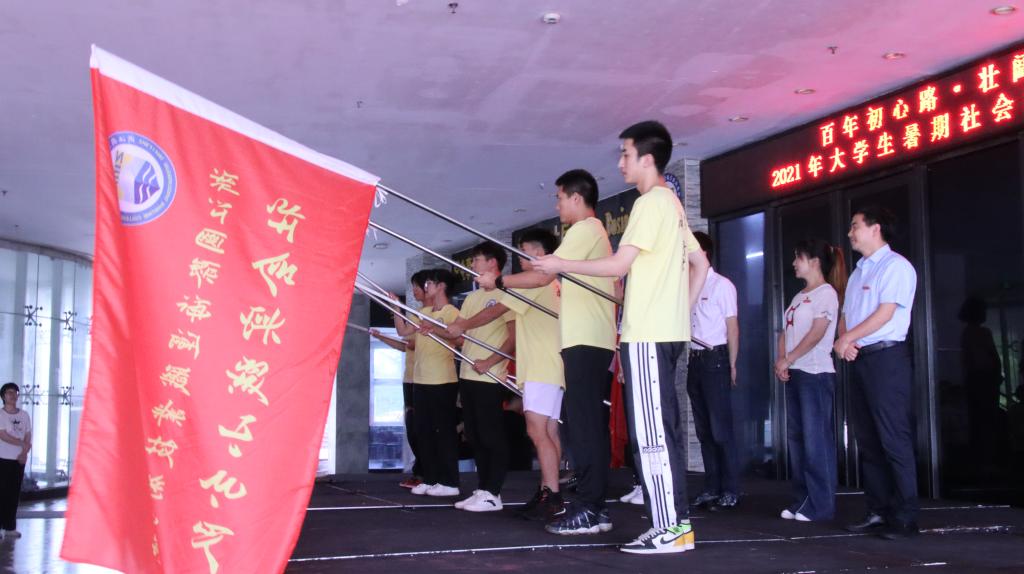 出征仪式上,校团委书记金洁、各二级学院党总支副书记为各学院社会实践队伍授旗。