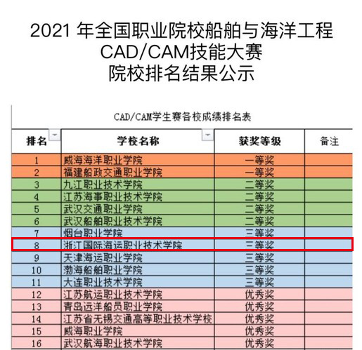 12月12日,2021年全国职业院校船舶与海洋工程CAD/CAM技能大赛顺利结束。因疫情影响,本次比赛通过线上进行。我校由董明海、赵陈两位老师指导,海洋装备工程学院陈鑫、傅端阳和季江丰等3名同学组成的代表队,经过上机实操测试和理论测试,最终获得团体三等奖。