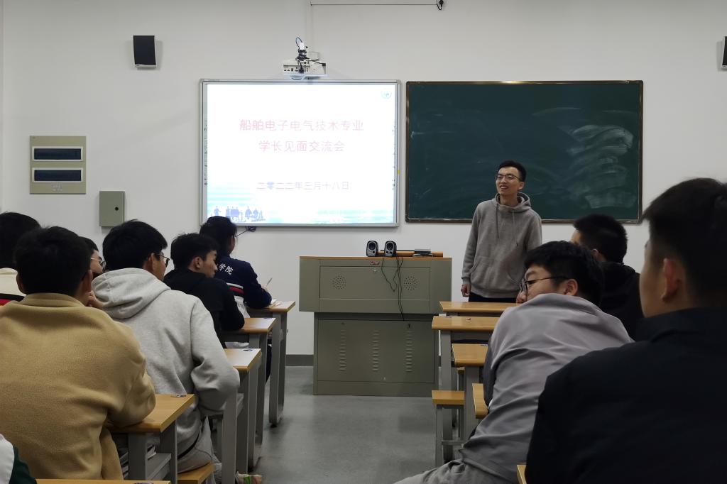 3月18日晚,航海工程学院船舶电子电气技术专业在综合实训楼212召开了学长见面交流会。本次交流会特邀了目前就职于东方海外货柜有限公司的原2015级船电1班孔家琪毕业生分享交流,学院2020级、2021级船电专业全体学生参加会议。