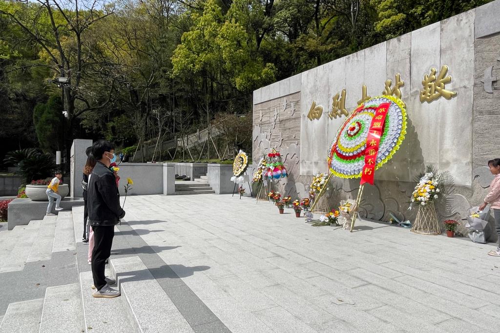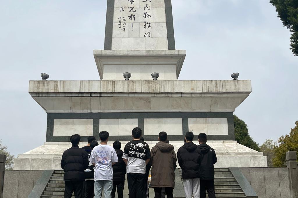 在纪念碑前,同学们献上鲜花,并弯腰鞠躬向烈士们表示沉痛哀悼,用最传统的方式向为革命而牺牲的烈士表达无限崇高敬意和哀思。