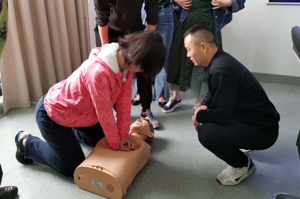金曙敏医师介绍了红十字运动起源、发展历史和应急救护等内容,重点就心肺复苏(CPR)和AED的使用进行了详细地讲解和示范。培训采用理论知识讲解和实际操作相结合的方式进行,金医师的专业、生动的讲解和精湛的救护技术深深吸引了在座的每一位教师。在分组练习时,大家积极操作急救技能,按照操作流程和要点,力求每一个动作标准、到位。