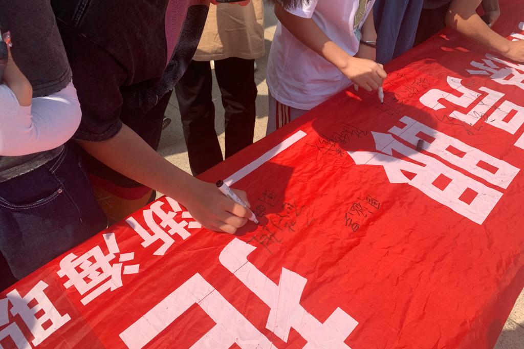 活动中400余名师生们在横幅上郑重写下自己的名字,表达了坚决不上当,坚决不受骗,构建安全和谐校园的决心和信念。同学们在签名后纷纷表示:“要牢记天上不会掉馅饼,馅饼下面有陷阱!”