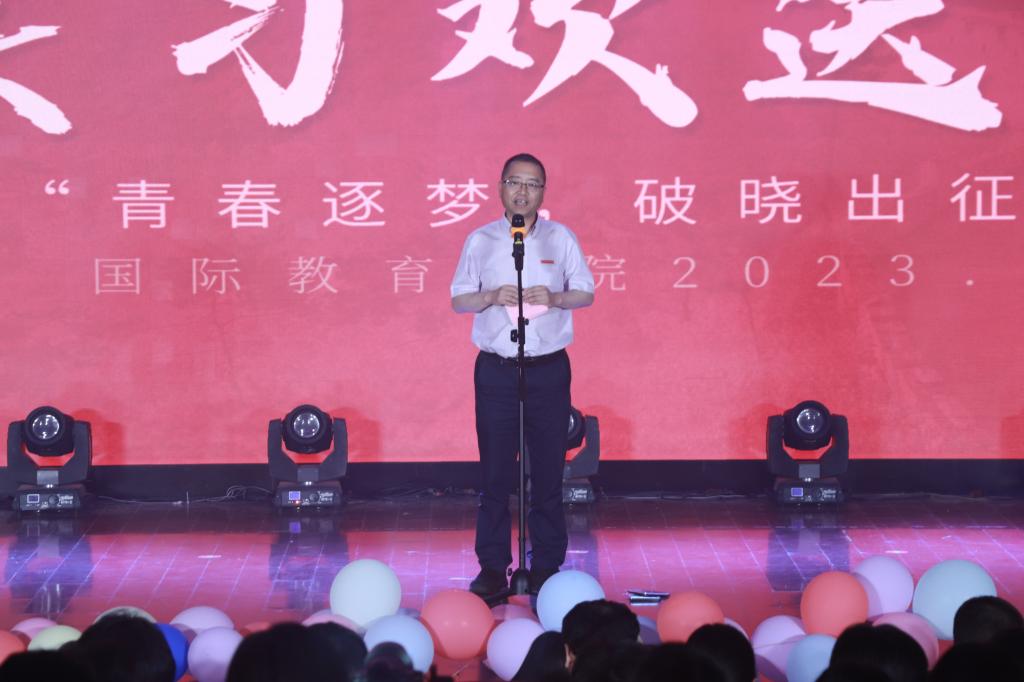 为了给即将奔赴实习岗位的同学们提供一个和老师、同学交流及展现自我的舞台,留下美好的青春记忆,同时表达学院领导、老师对实习生们的美好祝愿,国际教育学院6月2日举办了“青春逐梦,破晓出征”文艺汇演暨2023年实习生欢送会。校党委副书记孔志光,国际教育学院党支部书记、院长吴旭光及学院老师们应邀到场观看。