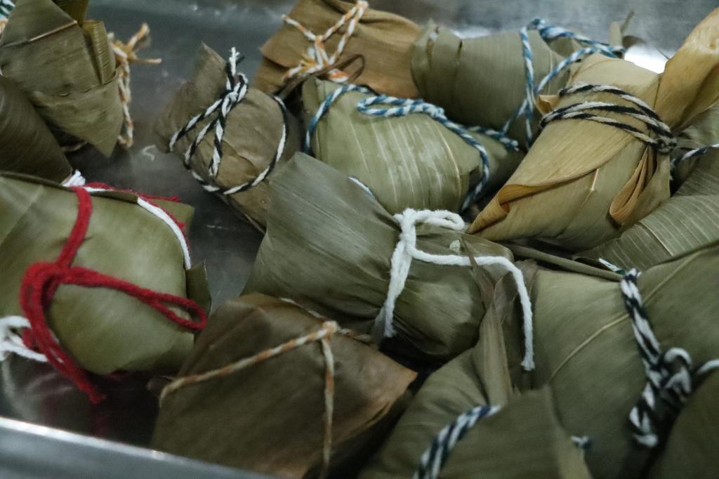 当天下午,活动参与者们齐聚学生食堂,以4-6人为一组,他们个个摩拳擦掌,各自挑选了甜、咸糯米,咸蛋黄、鲜肉、红枣、豆沙等馅料,在工作人员的细致教授下,同学们逐渐掌握了包粽子的要领,一个个或小巧或饱满的粽子逐渐成型,再扎上五彩的绳线,心中是满满的成就感。活动结束后,同学捧着蒸熟的粽子,眼里满是欣喜,纷纷表示要带回寝室送给自己的室友尝一尝。
