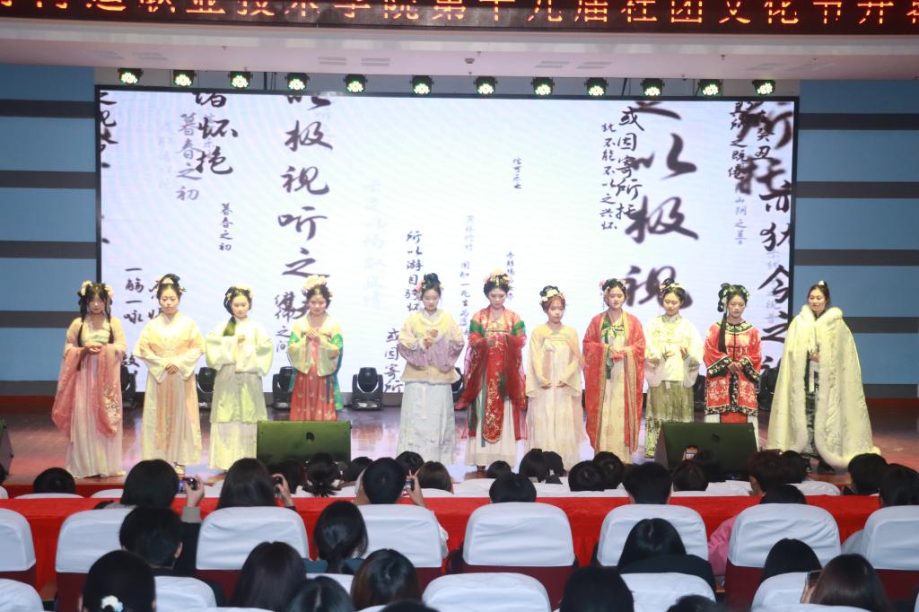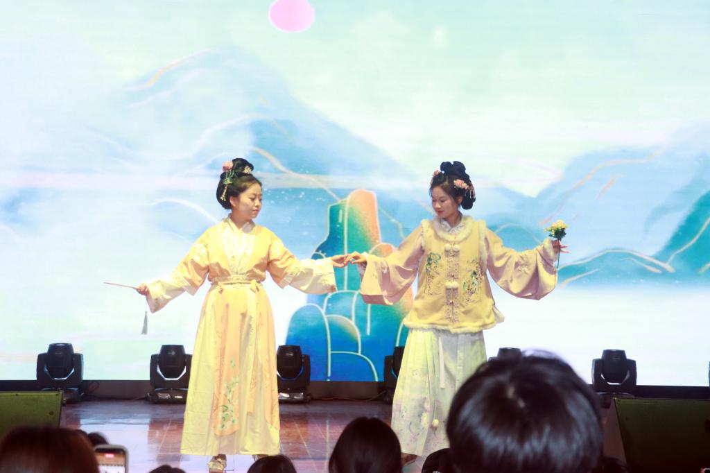 反邪教协会带来的中国古典舞《双面燕洵》、文艺社的古筝独奏《梦回还》令人眼前一亮。心理协会、大学生创业就业协会、国粹社联合带来的汉服走秀《归期》震撼全场,走秀采用以物拟人的创意形式,将流落海外的中华文物比作期盼归家的游子。社员们身着各式精美汉服,意喻不同朝代的中华瑰宝,表演既展现了中华文化的灿烂绚丽,更传递出当代青年对民族文化传承的责任担当。