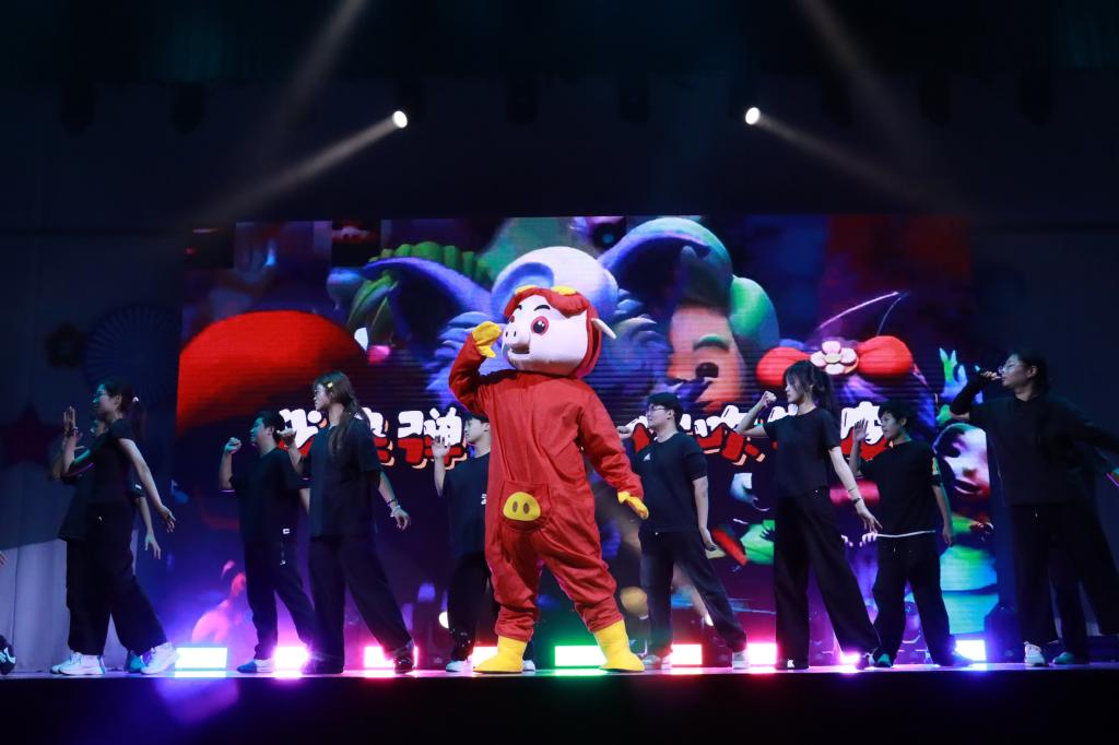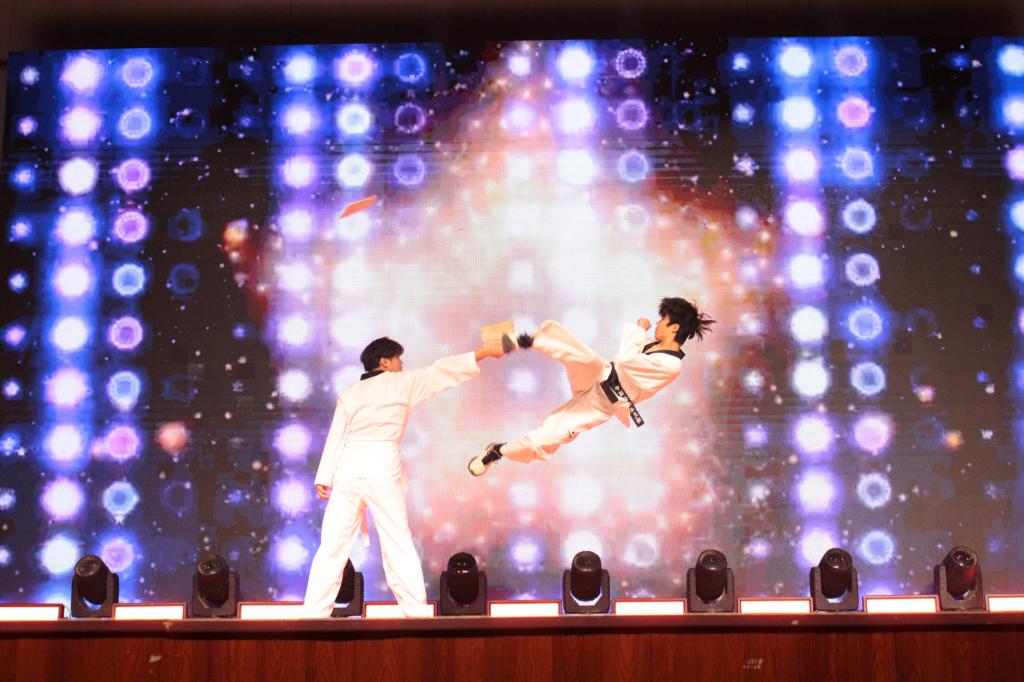 进入第三篇章“韵启华章”,龙吟虎啸队的《跆拳道综合表演》刚劲有力,展现力与美的融合;话剧社《怒吼》以情景剧形式传递时代强音;舞蹈《如愿》意境深远,舞出对未来的美好期许。晚会尾声,教师团队惊喜演绎舞蹈《你要跳舞吗》,轻松活泼的表演拉近了师生距离,赢得阵阵掌声。