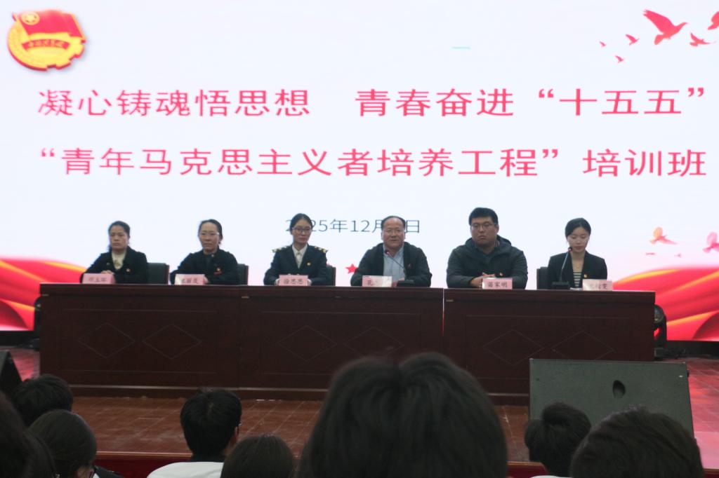 为深入学习贯彻党的二十届四中全会精神,以习近平新时代中国特色社会主义思想凝聚青年力量,12月8日,我校“凝心铸魂悟思想 青春奋进‘十五五’”2025年“青年马克思主义者培养工程”培训班开班仪式在图书馆四楼报告厅顺利举行。校党委副书记孔志光和各二级学院分团委负责人出席开班仪式,全体团支书、校院二级主要团学干部共200余人参加仪式,石油化工学院青马学员通过直播在线观看了仪式。仪式由学生会秘书长沈楷雯主持。