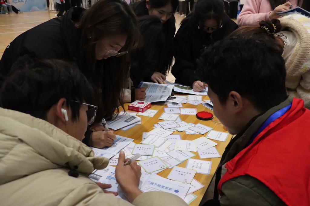 随后,体育馆内迎来了学校招就办组织的“职业生涯规划嘉年华”活动。现场精心设置了十大体验板块,涵盖职业认知、技能探索、规划实践等多个维度。在“制定成长计划”区域,同学们结合专业特点与个人兴趣,初步勾勒出自己的发展蓝图。而备受追捧的“打卡集章”活动,则通过趣味任务串联起“走进兴趣学堂”、“摘下硕果累累”等环节,引导学生在互动挑战中深化自我认知与职业探索。