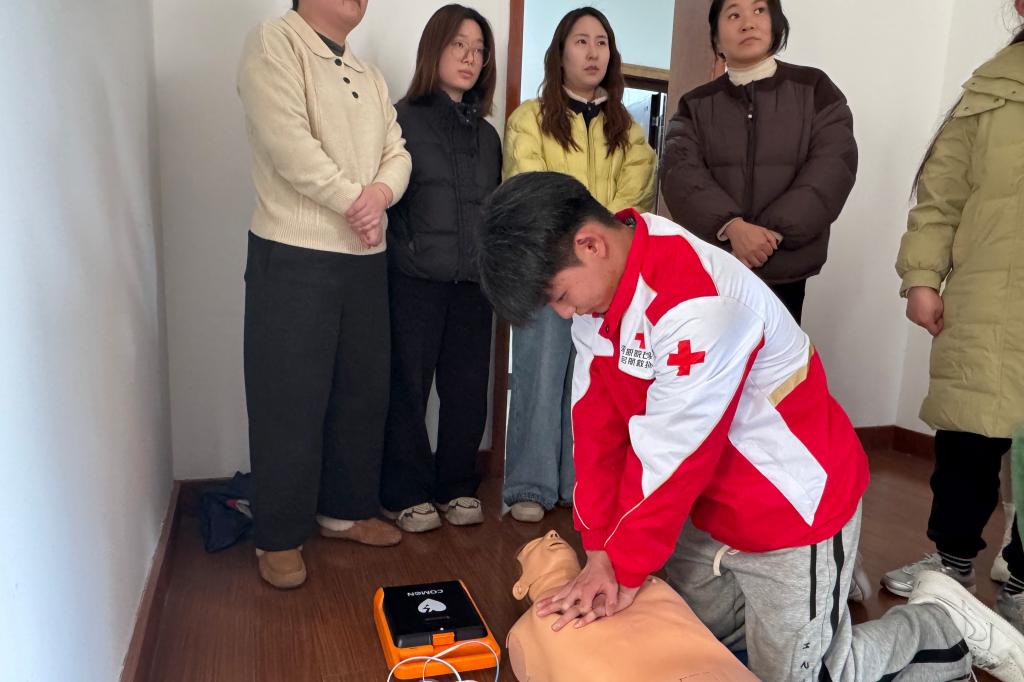培训现场,实操环节氛围热烈,学员们热情高涨、踊跃参与,纷纷在模拟人上反复练习急救技能。“手臂要垂直,借助身体重量向下按压,不要用手臂发力!”“胸外按压深度至少5厘米,频率务必保持在每分钟100-120次,节奏要均匀!”启航救护队的队员们分组行动,化身专业“教官”,耐心细致地讲解每一个操作要点,对每位学员的按压位置、力度、频率,以及人工呼吸的开放气道手法、吹气节奏等进行手把手纠正、一对一指导,确保每位学员都能掌握规范的急救技能,真正做到“学懂、弄通、会用”。