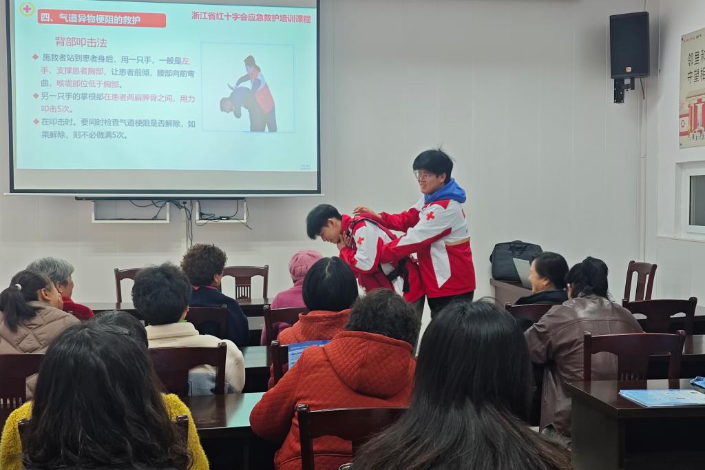 随后,启航救护队队员开展海姆立克急救法教学,利用模拟人演示急救手法,总结“剪刀、石头、布”口诀,并邀请居民现场实操练习。