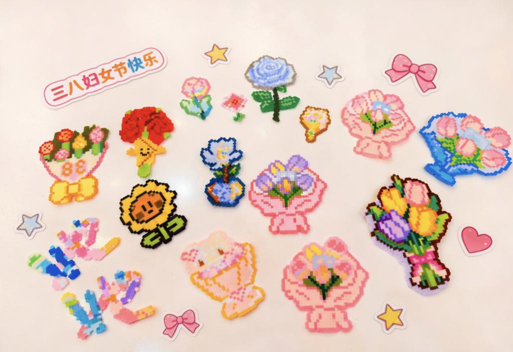 活动现场温馨而富有创意。粉色、红色、金色等暖色调拼豆整齐陈列,与花朵、爱心、字母等基础造型模板相映成趣,营造出浓厚的创作氛围。社员们围坐一堂,以镊子为笔,以拼豆为墨,在方寸模板间精心镶嵌。温柔的粉玫瑰在指尖绽放,热烈的花束定格美好,寓意女性独立、自信、优雅的品格,更有社员将爱心与星光巧妙组合,创作出独具匠心的抽象作品,致敬女性如星辰般闪耀的光芒。