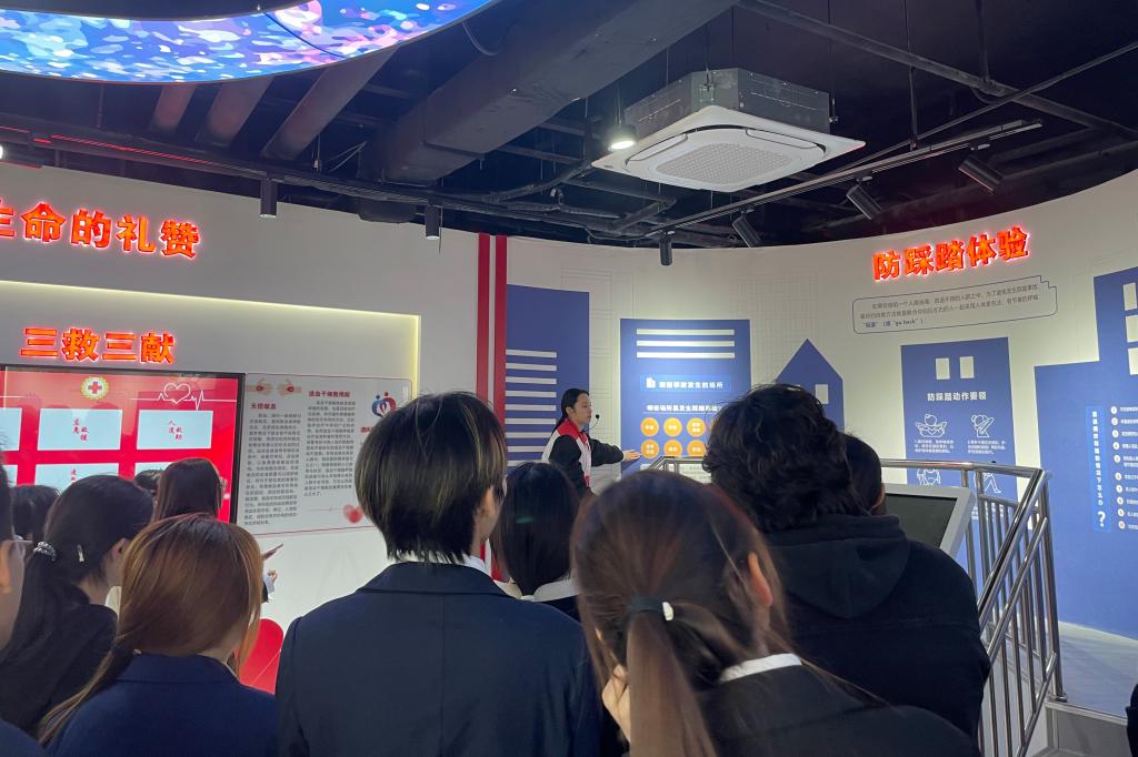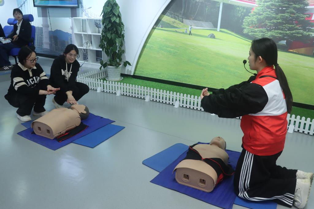 祭扫活动结束后,师生们前往舟山市生命教育体验馆进行了实操体验学习。在紧急逃生体验环节,场馆工作人员详细讲解了火灾发生时的逃生技巧,并组织师生模拟真实火灾场景,进行逃生演练;应急救护环节则重点讲解了心肺复苏(CPR)等实用技能,帮助师生熟练掌握应急救护本领。此外,讲解员还与师生模拟了心理健康沙盘的作用;在反诈防骗宣传环节,通过案例讲解、情景模拟等形式,向师生普及反诈防骗知识,提醒大家提高防范意识,守护自身财产安全。