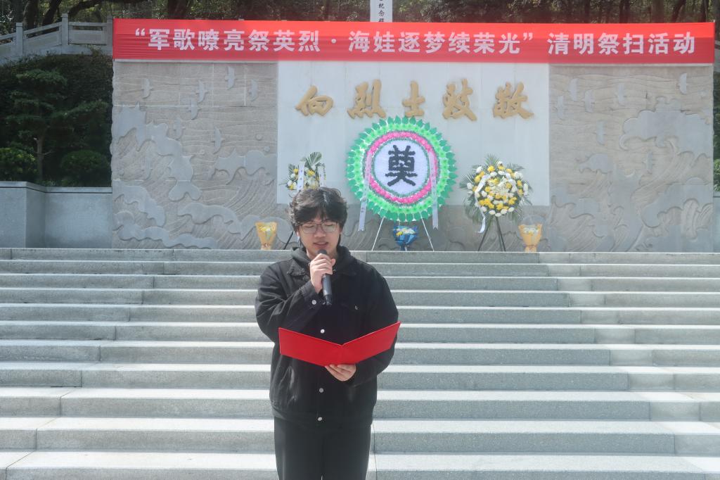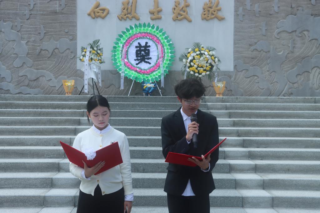 悼念仪式上,校广播站王涛、符衢仪献上了《忠魂永驻,山河常青》诗朗诵,他们以饱含深情的语调传递着对烈士的崇高敬意与深切追思。随后,学生代表谢文涛分享了自己参加省科技创新竞赛的备赛经历,号召同学们继承先烈遗志,用科学知识技能作为现代武器,为实现中华民族伟大复兴的中国梦添砖加瓦。