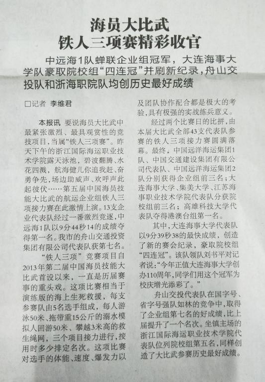 要说海员大比武中最紧张激烈、最具观赏性的竞技项目,当属“铁人三项赛”。昨天下午的浙江国际海运职业技术学院露天泳池,碧波翻腾、水花四溅,航海健儿你追我赶、奋勇争先,场边助威声、欢呼声此起彼伏……第五届中国海员技能大比武的航运企业组铁人三项接力赛在此激情上演。13支企业代表队经过一番激烈竞逐,中远海1队以9分44秒14的成绩夺得第一名。我市的舟山交通投资集团有限公司代表队获第七名。