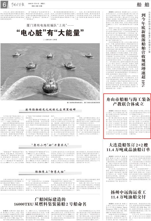 1月16日,舟山市船舶与海工装备产教联合体在浙江国际海运职业技术学院成立。据了解,联合体旨在通过搭建“政行企校”协同育人新机制、创新“双向四同”培养新范式、打造“五金建设”育人新高地、建设“产学研用”技术新平台、探索“职教出海”国际新路径。